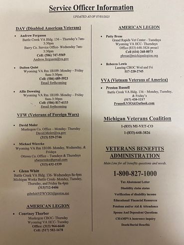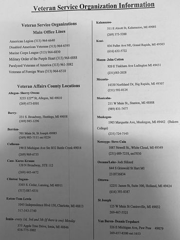 Our service officer is currently unavailable to obtain information of other resources please call (231) 796-4772 or e-mail us at dav18mi@gmail.com.